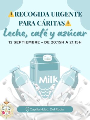El próximo sábado, 13 de septiembre, de 20:15h a 21:15h, realizaremos una recogida solidaria de LECHE, CAFÉ y AZÚCAR en nuestra Capilla, con destino a Cáritas.